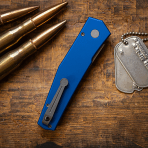 Meanwhile, the handle – also giving Clyde, to be honest – is made from the Pro-Tech speciality, finely-finished aluminum, with the button deployment mechanism located right beneath the pivot in a little nook all to itself. The rodential GiantMouse logo is cleanly etched into the show-side scale on either model – there being both a blue and a black handle ano option on this one.