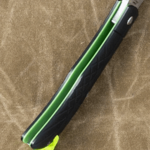 A ridged grip, with two separate zones for the fingers, defines the Timber Jack handle – and again, it’s a design element brought over more or less unchanged from the LaRock custom. Jack Wolf is putting their spin on the model with the trim levels and attendant material choices: the Ultralight versions come with scales made of cross-hatched G-10 and smooth faux bolster, while the four Steel Series versions feature steel bolsters and a choice of four materials for the scales: brown/black Richlite, red canvas Micarta, and two different flavors of Kirinite.