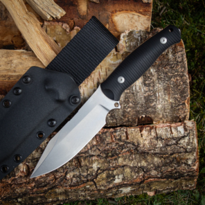 The Redington’s handle is big, roomy, and contoured, with 3D-milled black canvas Micarta scales laid on the full tang. It’s a handful in the best possible way. Large scope chopping isn’t the only thing the Redington may be called upon to do, and thus the designers gave it a massive forward finger choil beneath the edge, as well as mid-spine jimping, for precision as well as power while it’s working. The Redington weighs 6.8 oz. and comes with a Kydex sheath.