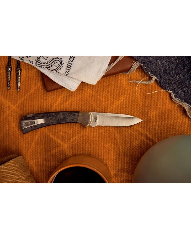 Either way, this is an admirably restrained collector’s version of the 112 Ranger, tailored for performance as much as shelf-bound perfection. The 3-inch drop point blade is made from S35VN, a proven super steel staple, here enhanced by the crucial Bos heat treat; the long pull nail mark here provides the sole method of opening the knife and a very tangible connection to the earliest iterations of this long-running 110 descendant.