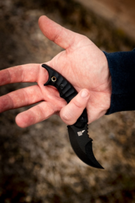 Mooney gave the Upswarm a handle just as characterful and interesting as the blade. it’s a mid-intensity arc shape with three big finger grooves to calibrate the grip; and, on the butt end, is a karambit-style flourish: not the full finger ring, but a sort of half-ring, providing a lot of the same orientation advantages as the former without the risk of getting tangled up in an actual loop. The scales are black canvas Micarta, the sheath Kydex, and the total weight in-sheath is 6.3 oz.