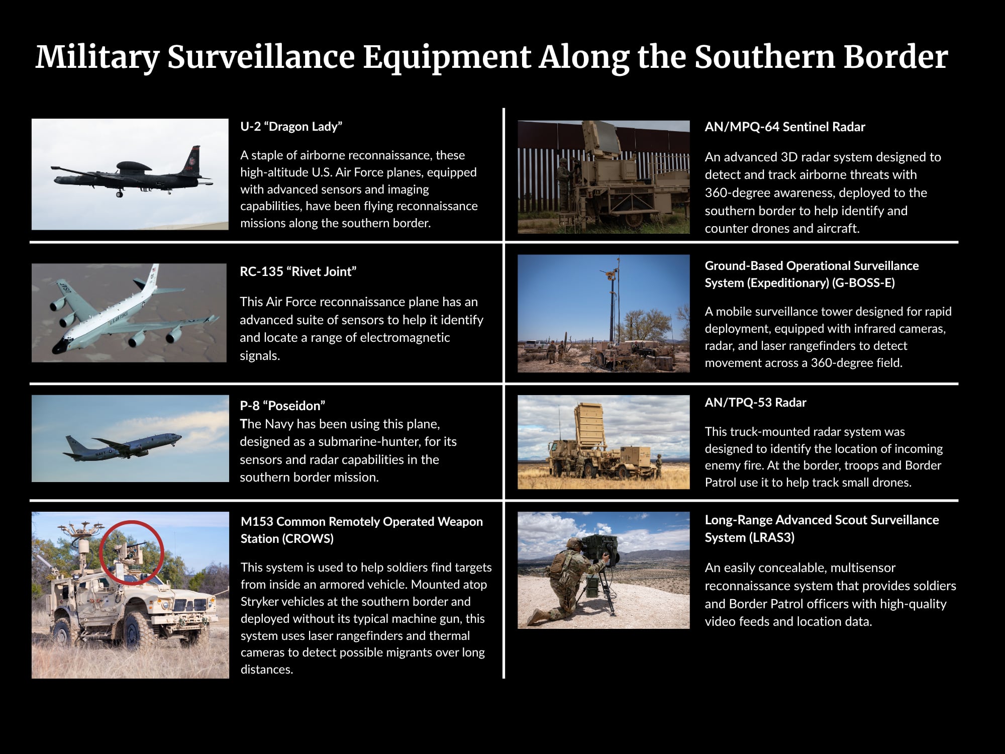The Defense Department is increasingly working with DHS to integrate intelligence from this growing network of sensor and surveillance systems, adding its own assets that troops have brought to the border, like the G-BOSS and other high-tech imaging and radar systems. Military pilots are also now flying reconnaissance missions along the border.