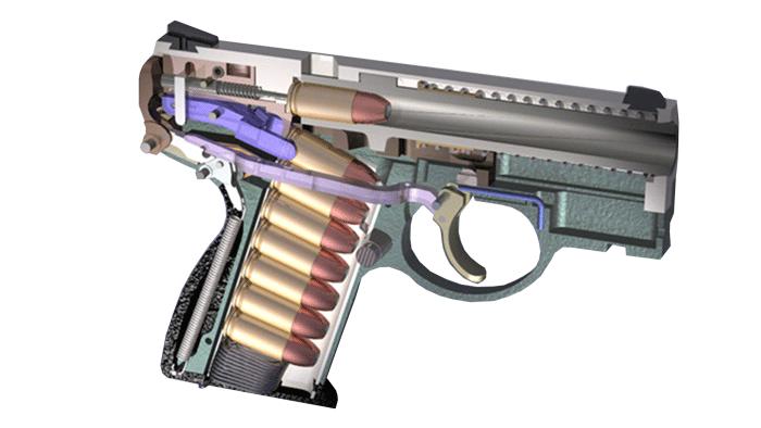 Animated cutaway of the Bond Arms BullPup9, showing the reverse-feed mechanism and rotating-barrel lockup operating in sync — courtesy of Bond Arms.