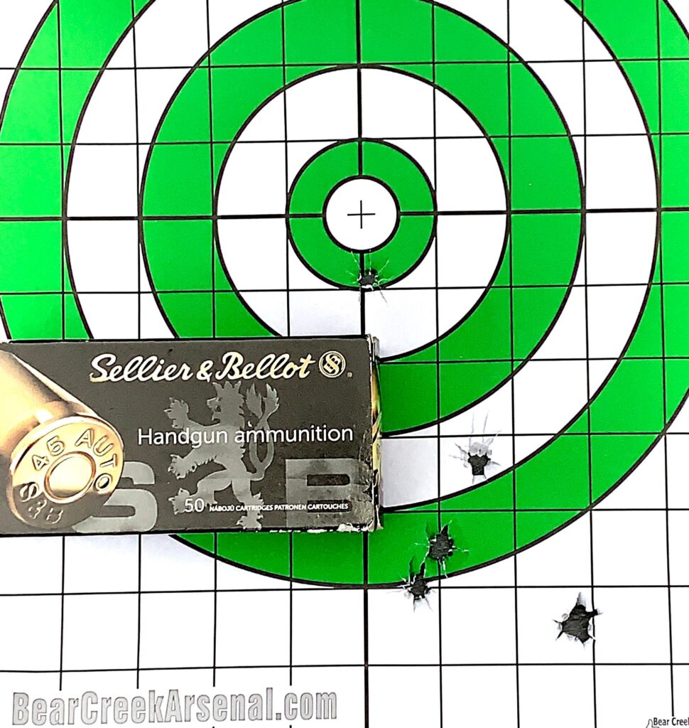 Anyway, I shot those two loads and got average group sizes. I then raided an ammo drawer and pulled out some S&B 230-grain FMJ, and got a few targets similar to this one: